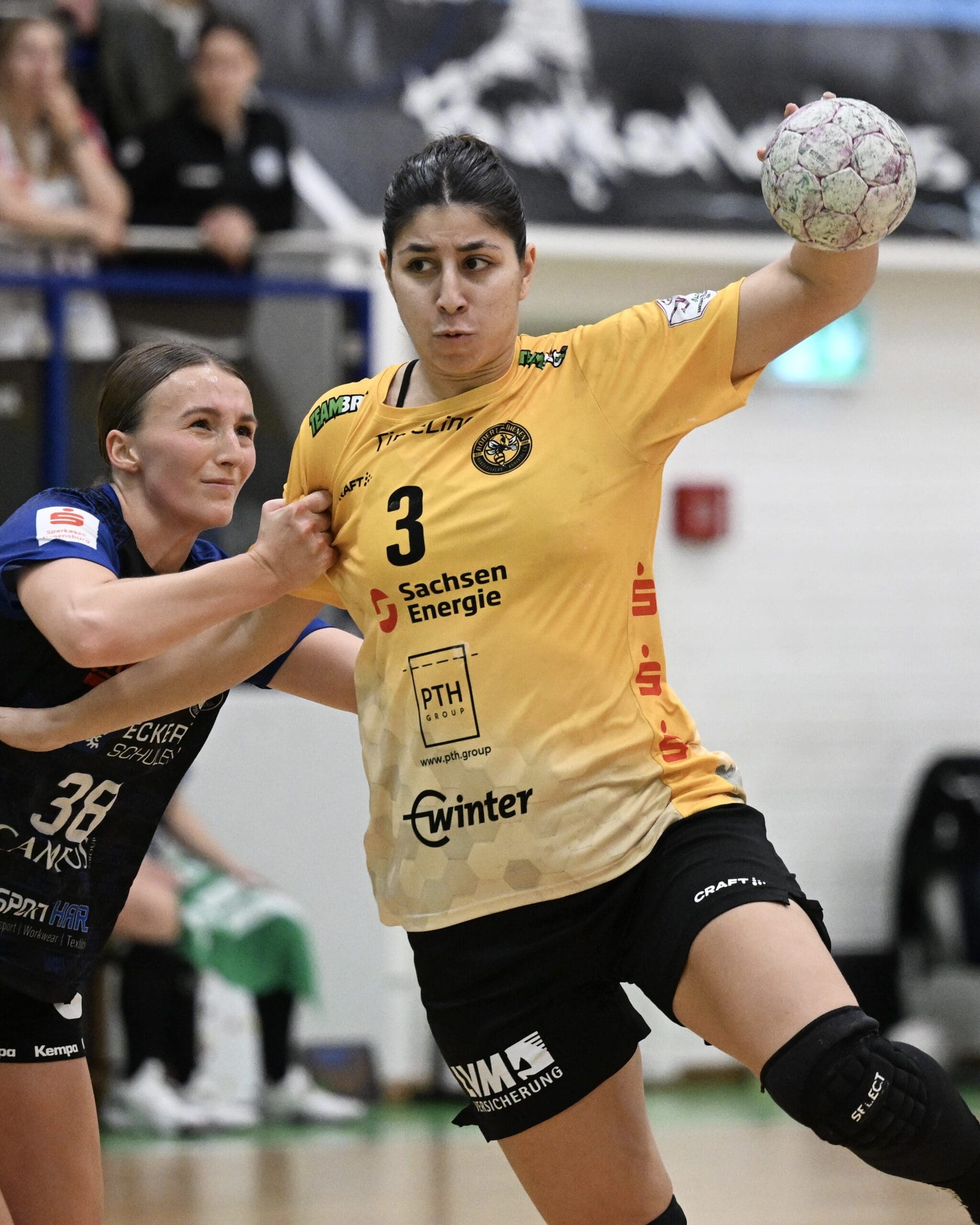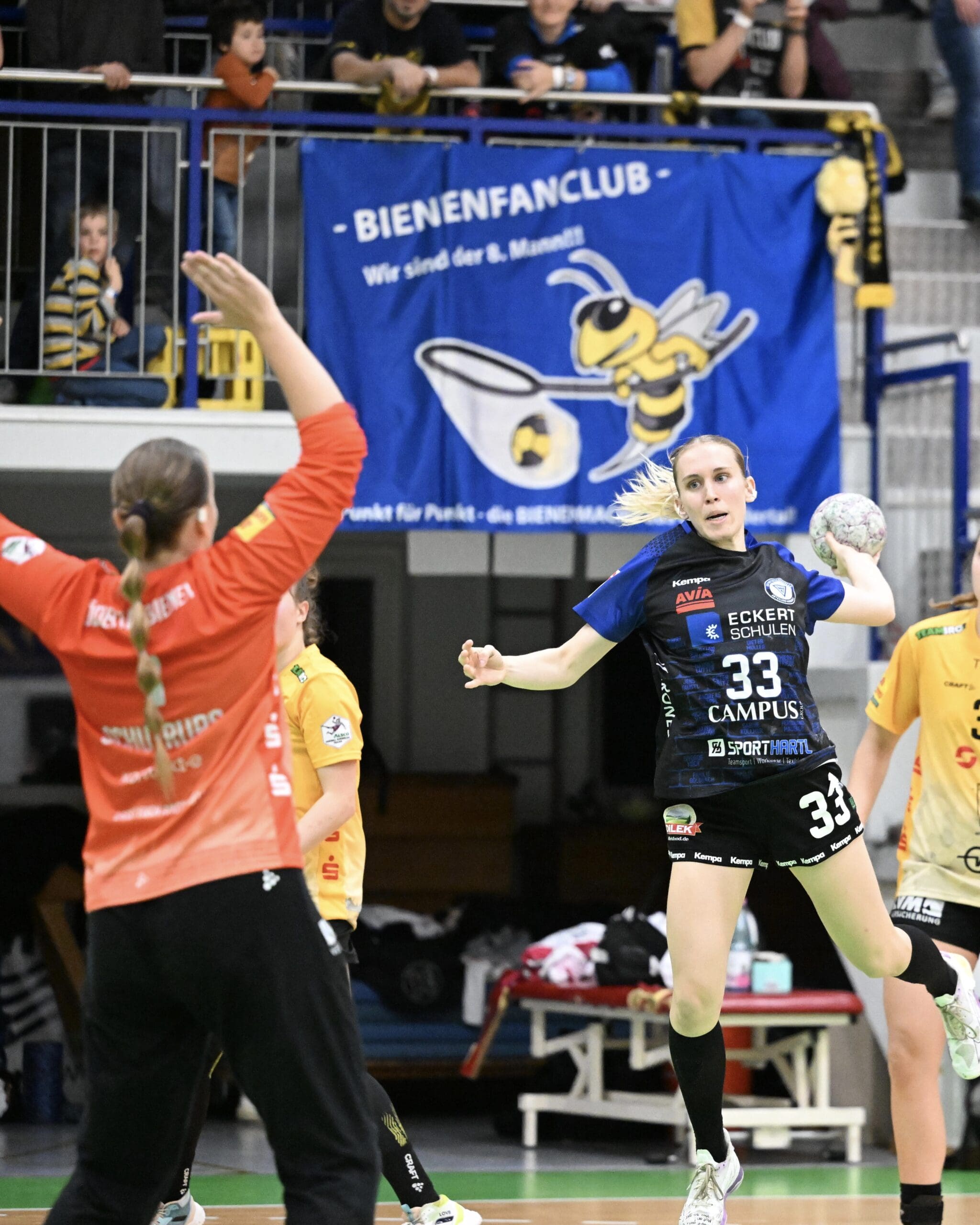 Doch auf die Abwehr um Larissa Schutrups, die den Regensburgerinnen immer mehr den Zahn zog, war Verlass. Nach einer Viertelstunde trifft Zoe Davenport vom Siebenmeterpunkt sicher, Alicija Pękala sorgt für die erste Drei-Tore-Führung, was Gästetrainer Bernhard Goldbach zur ersten Auszeit veranlasste. Besser lief es beim ESV danach nicht. Anders die Bienen, die hinten den Bunker quasi verriegelten. Abwehrchefin Vannessa Huth klaute gleich zwei Bälle hintereinander. Ab der zehnten Minute ließen die HCR-Spielerinnen kein Gegentor mehr zu. Larissa Schutrups parierte schon in Hälfte eins zwölf Mal (70 Prozent) und war der Garant für die klare 14:5-Führung der Gäste aus dem Rödertal, die sogar noch neun Fehlwürfe verbuchten.