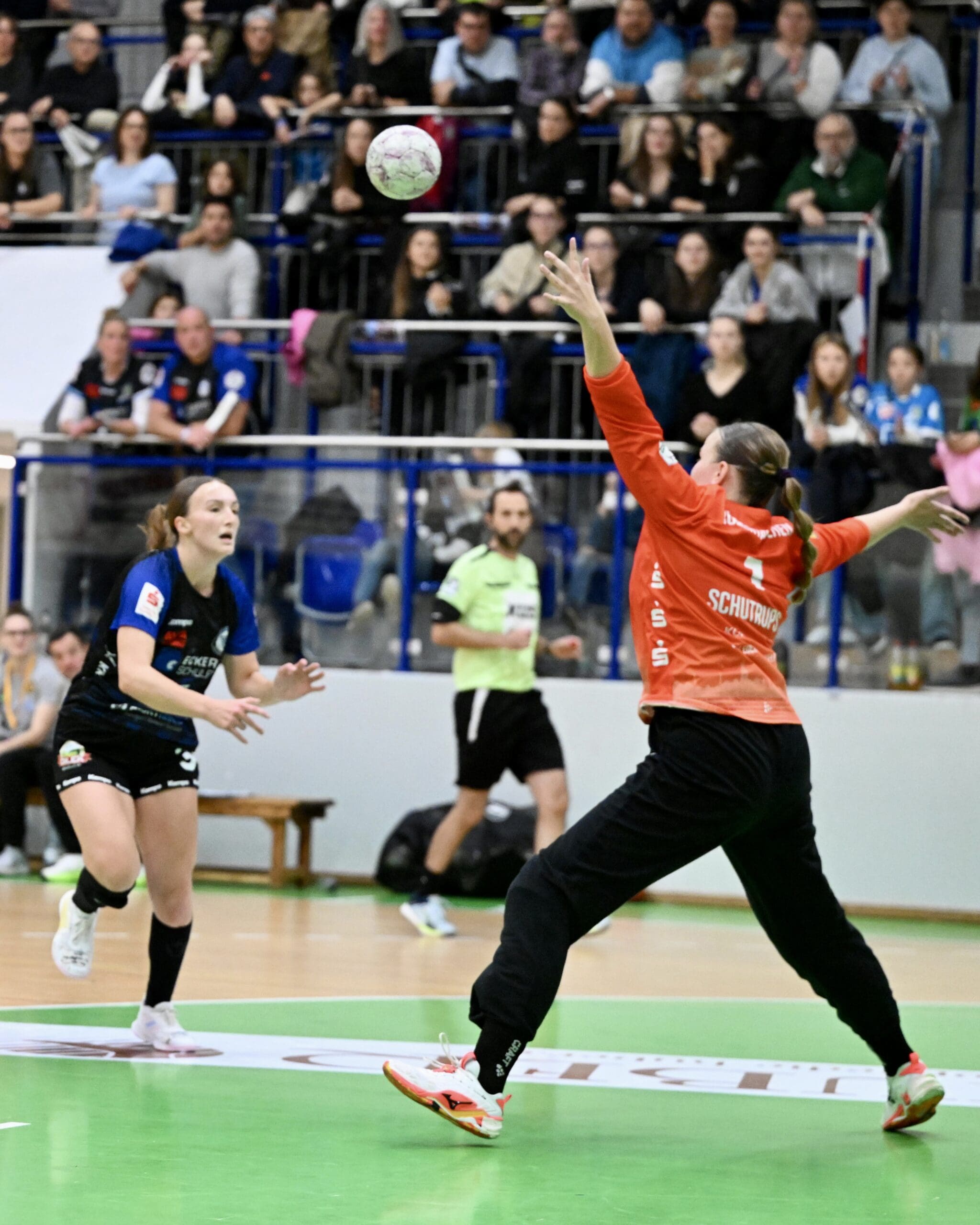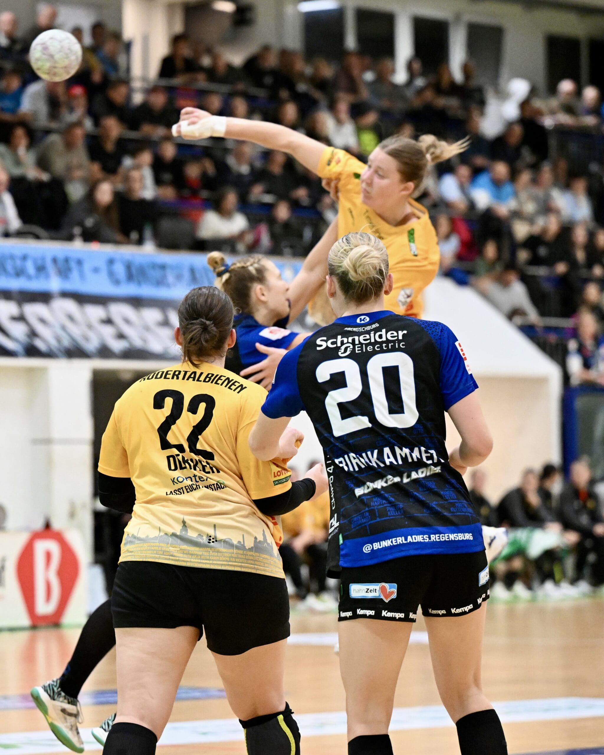 In Regensburg hatte Larissa Schutrups den Bunker mit 21 Paraden (53,85 Prozent) praktisch verriegelt. Und noch besser: Als Ann Rammer von der Bank zum Siebenmeter kam, wurde auch dieser Ball pariert – hundertprozentige Quote. Mit insgesamt 54 Paraden – neun im Schnitt pro Spiel – ist die Niederländerin Larissa Schutrups auf Rang zwei der Liga hinter der Dänin Sarah Norregaard Thomsen von Waiblingen.
