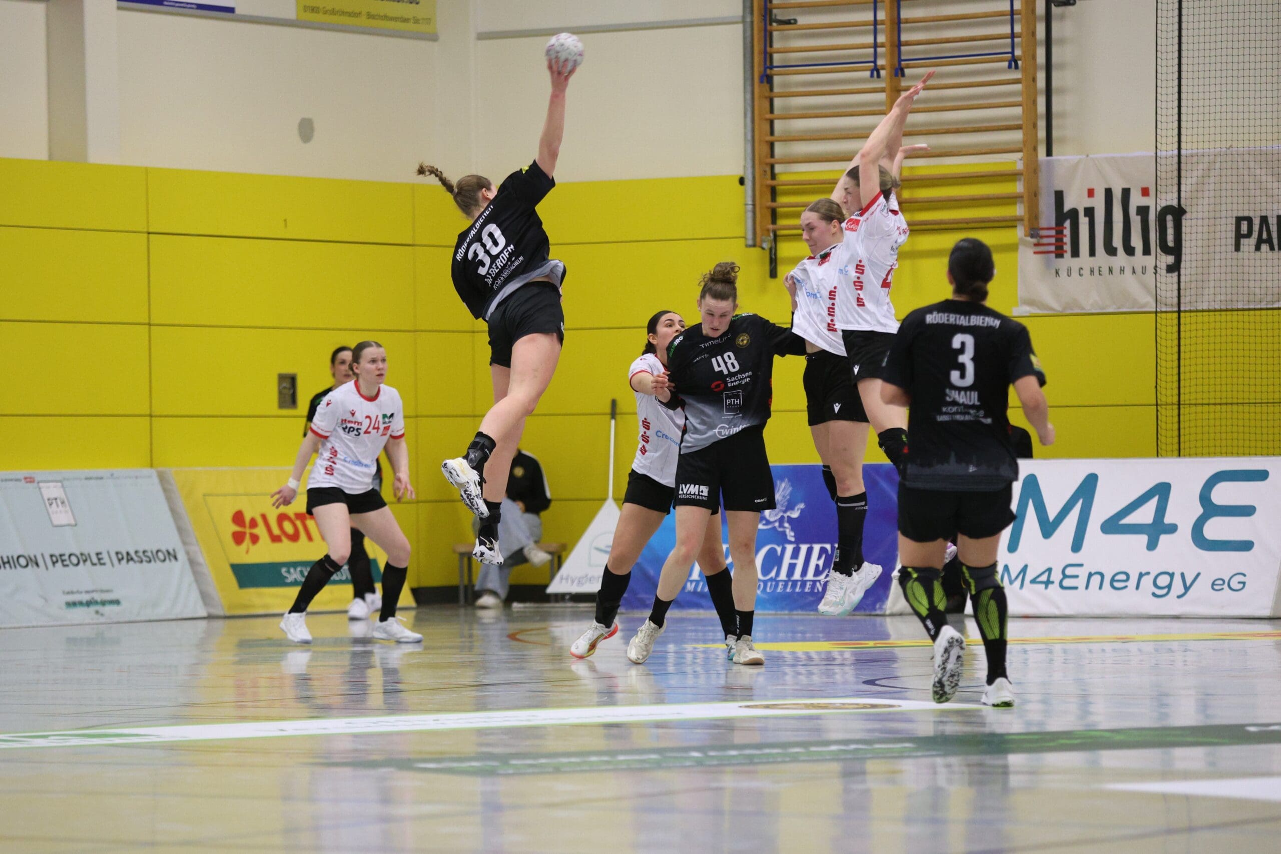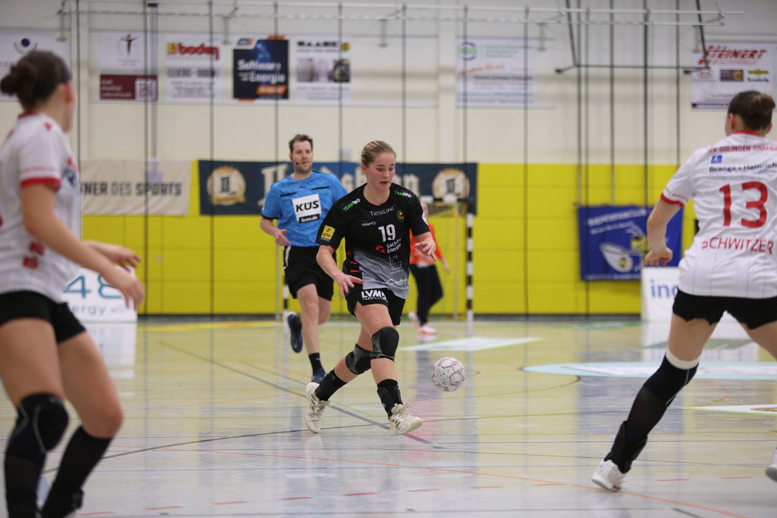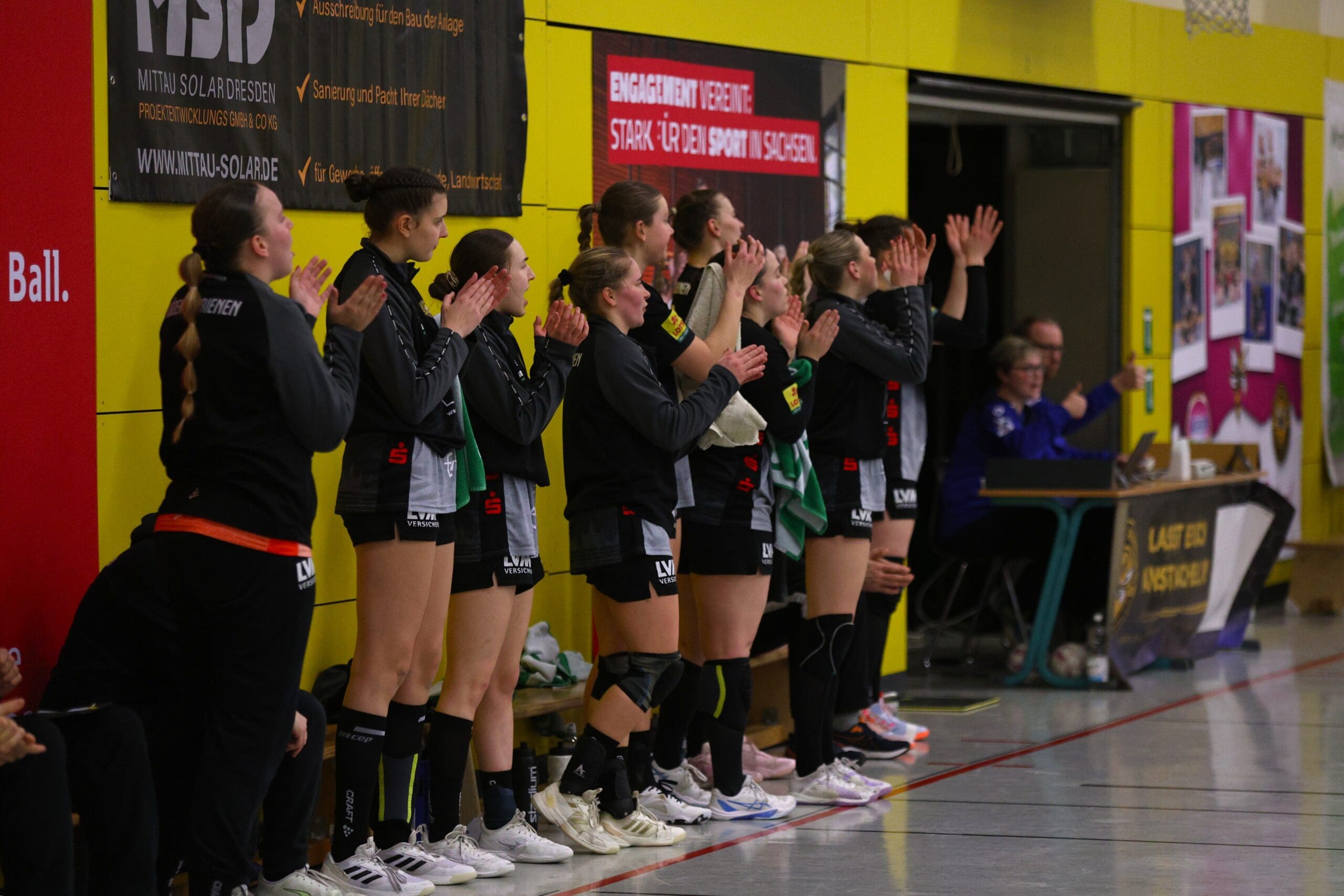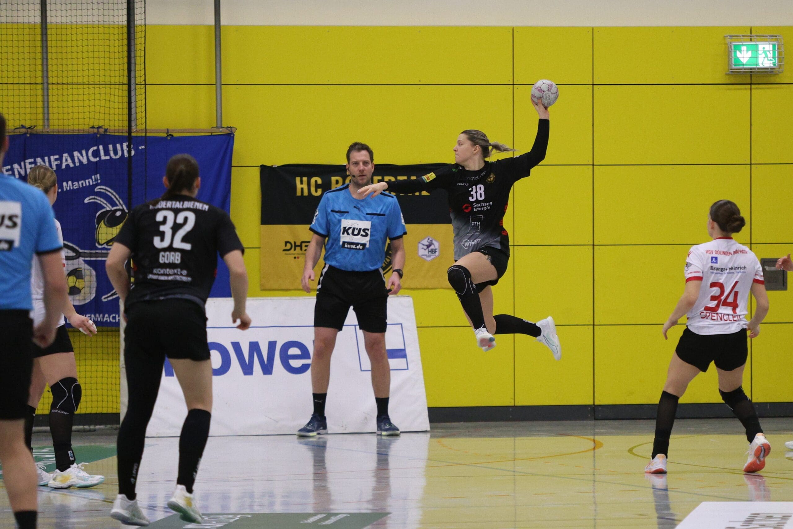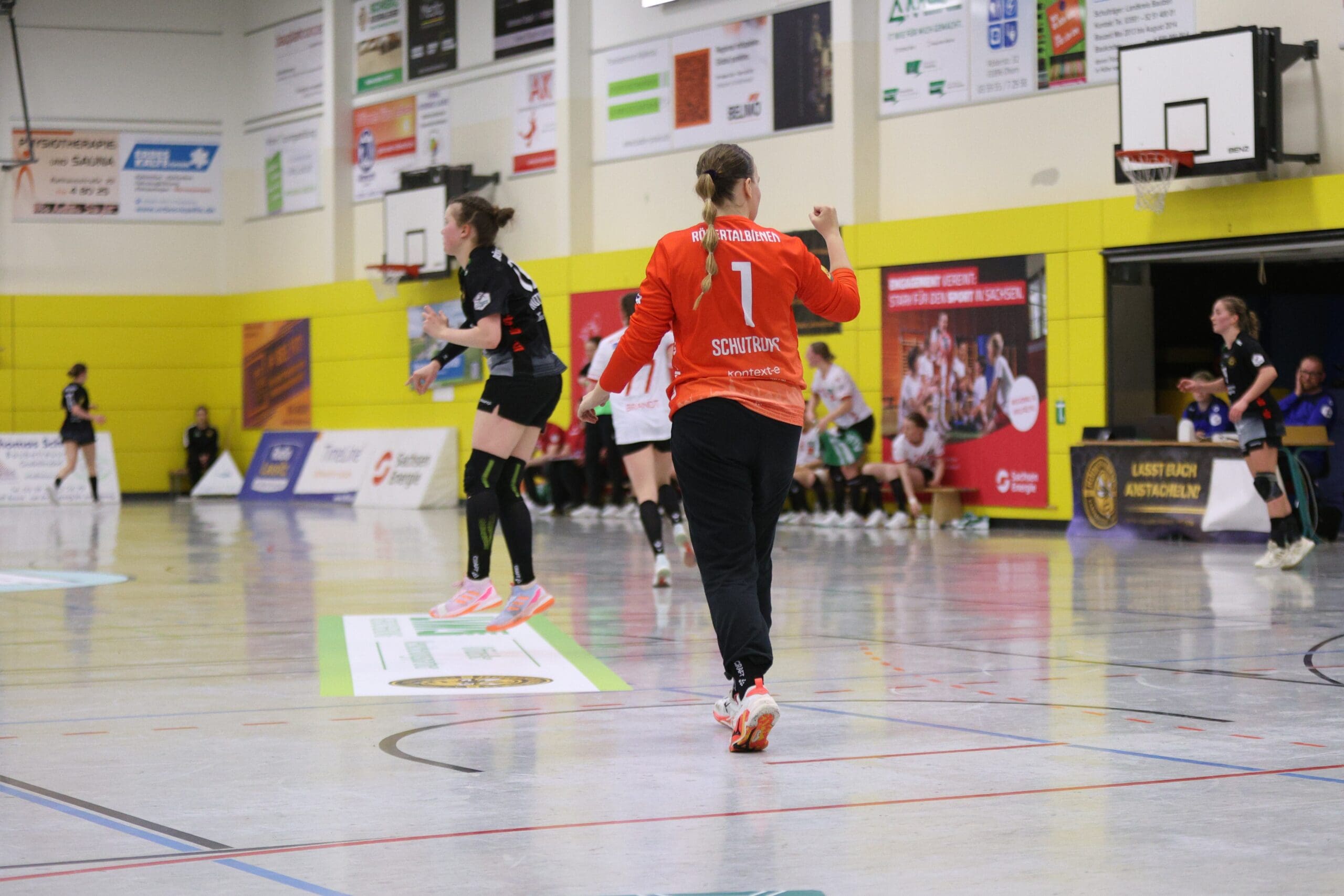 Cheftrainerin Maike Daniels hatte bereits im Vorfeld vor der Spielstärke der Solingerinnen gewarnt und ihre Vorahnung sollte sich auch bestätigen. Die Gäste begannen sehr selbstbewusst und übernahmen die Initiative. Die Rödertalbienen fanden schwer ins Spiel und machten zu Beginn des Spiels ungewohnt viele technische Fehler. Das nutzten die Gäste und gingen in der 13. Minute mit 7:4 in Führung. Daniels musste bereits früh ihre erste Auszeit nehmen und sie kam genau richtig. Sie forderte von ihrem Team eine wesentlich höhere Konzentration und konsequentere Abschlüsse. Nun kam mehr Ruhe in das Spiel und nach weiteren sechs Minuten konnte Rödertal zum 8:8 ausgleichen. Jetzt war es ein Spiel auf Augenhöhe, beide Teams schenkten sich nichts und so ging es beim 13:13 in die Halbzeitpause. Alles war noch offen und die zweite Hälfte musste die Entscheidung bringen.