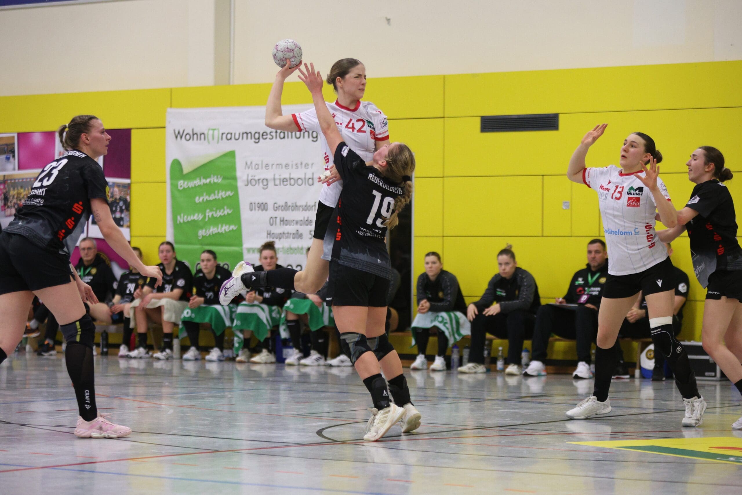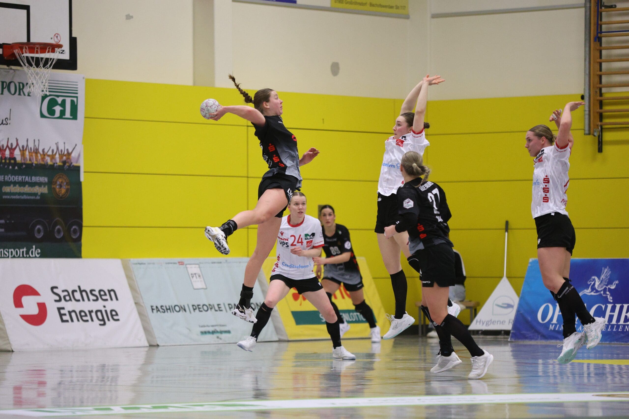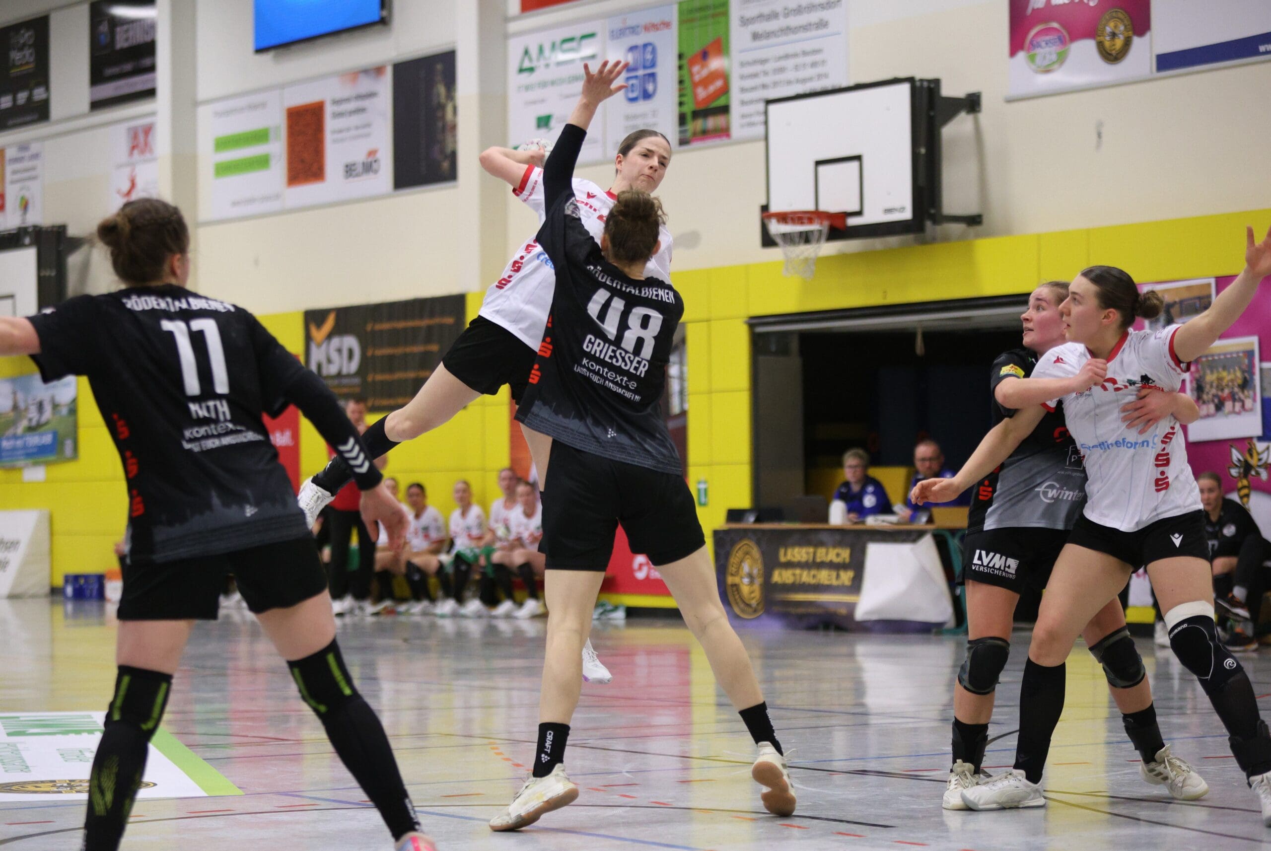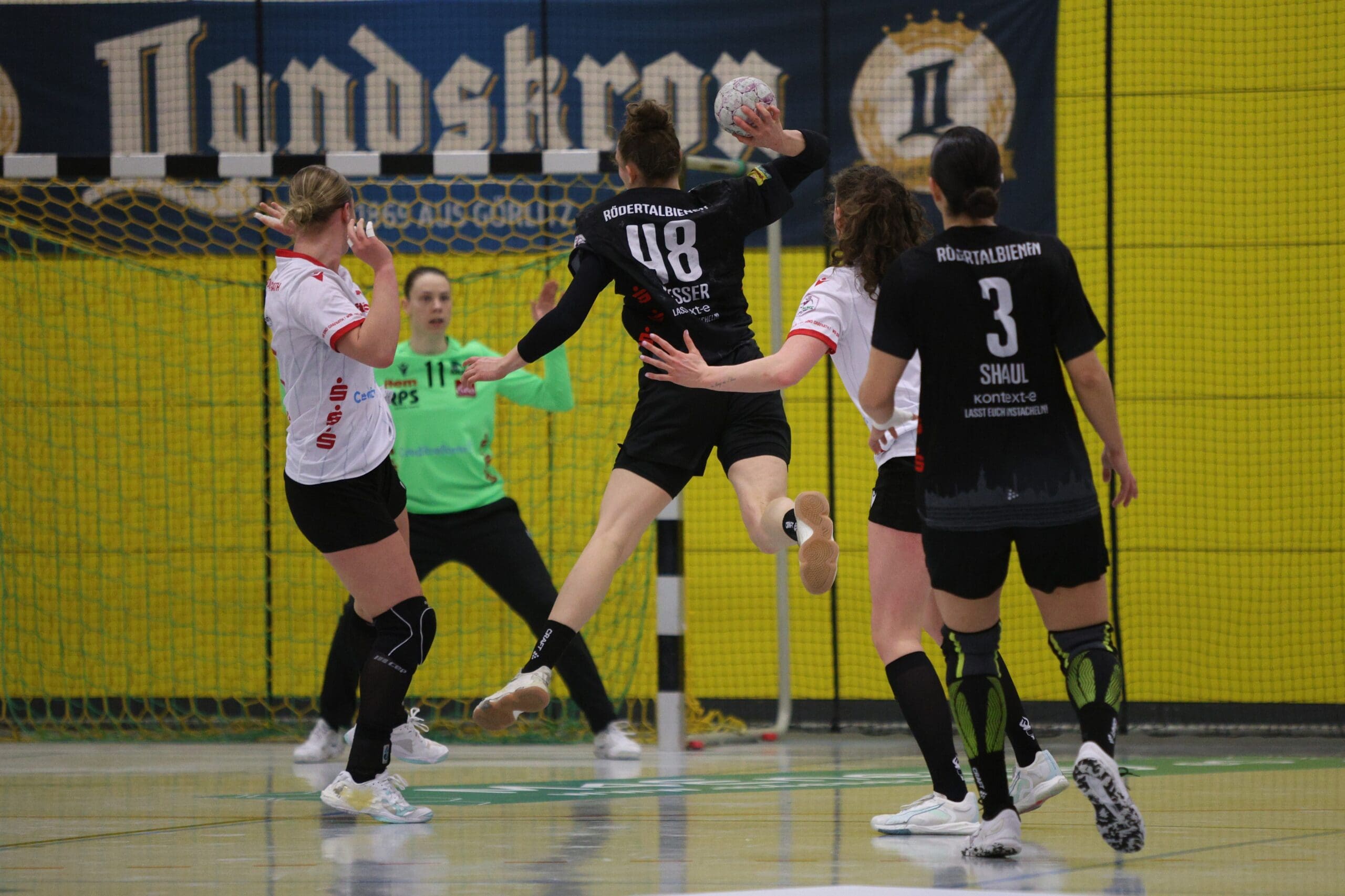 Cheftrainerin Maike Daniels hatte bereits im Vorfeld vor der Spielstärke der Solingerinnen gewarnt und ihre Vorahnung sollte sich auch bestätigen. Die Gäste begannen sehr selbstbewusst und übernahmen die Initiative. Die Rödertalbienen fanden schwer ins Spiel und machten zu Beginn des Spiels ungewohnt viele technische Fehler. Das nutzten die Gäste und gingen in der 13. Minute mit 7:4 in Führung. Daniels musste bereits früh ihre erste Auszeit nehmen und sie kam genau richtig. Sie forderte von ihrem Team eine wesentlich höhere Konzentration und konsequentere Abschlüsse. Nun kam mehr Ruhe in das Spiel und nach weiteren sechs Minuten konnte Rödertal zum 8:8 ausgleichen. Jetzt war es ein Spiel auf Augenhöhe, beide Teams schenkten sich nichts und so ging es beim 13:13 in die Halbzeitpause. Alles war noch offen und die zweite Hälfte musste die Entscheidung bringen.