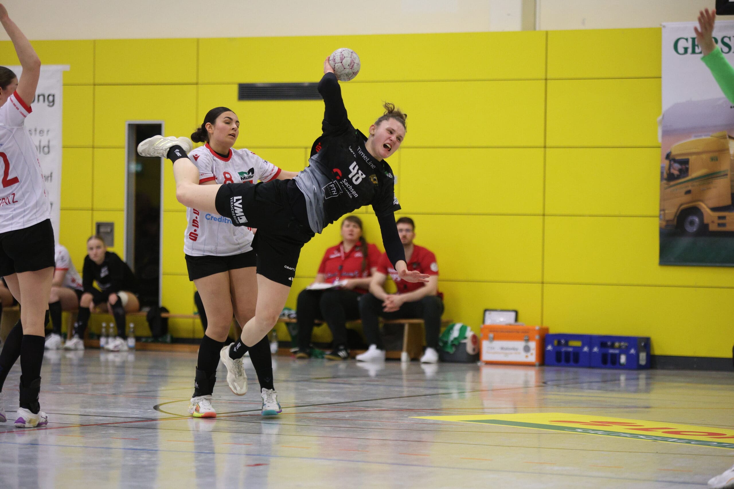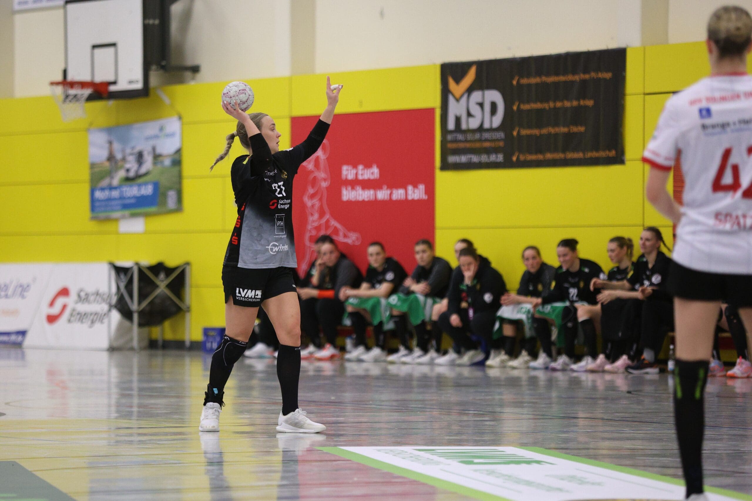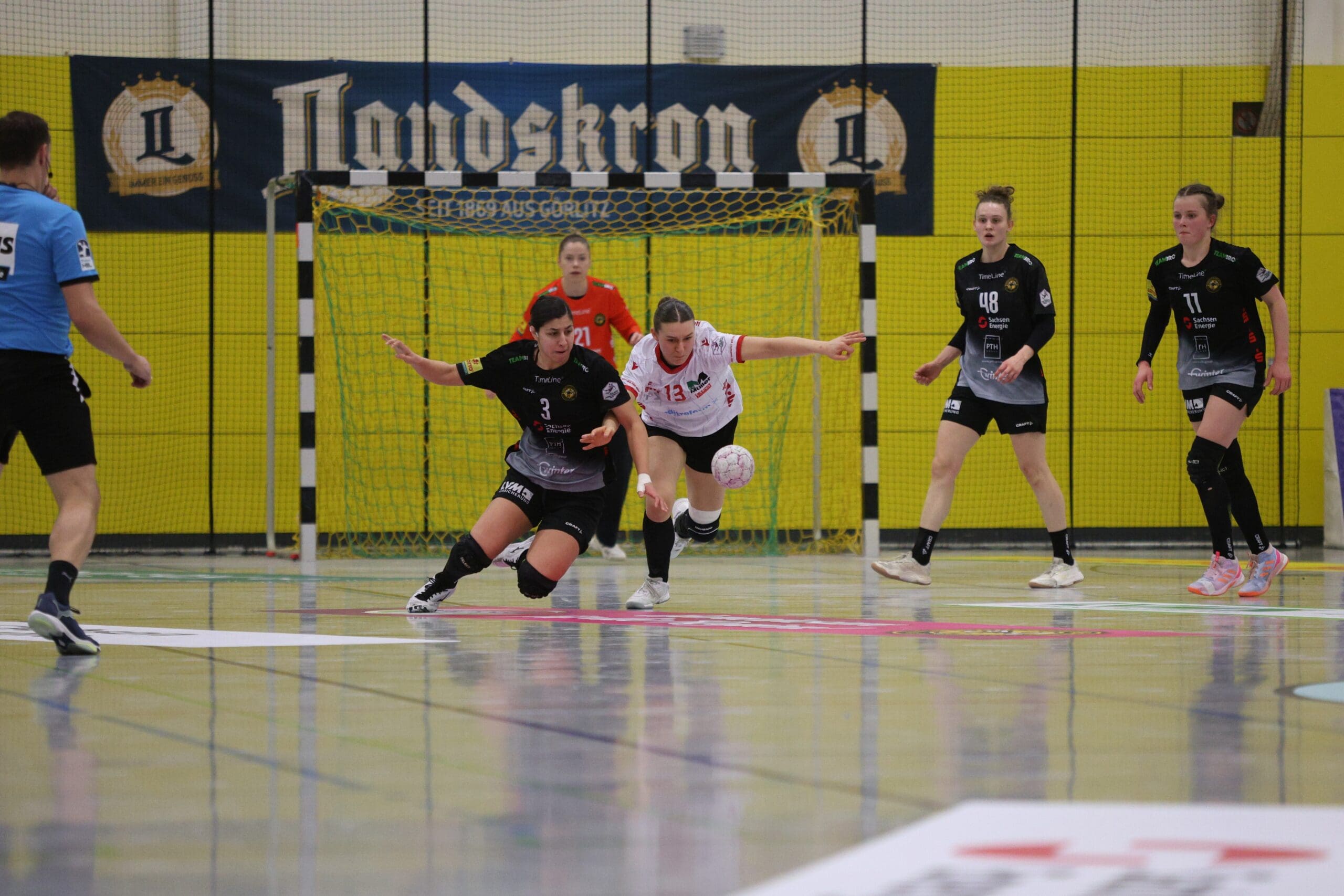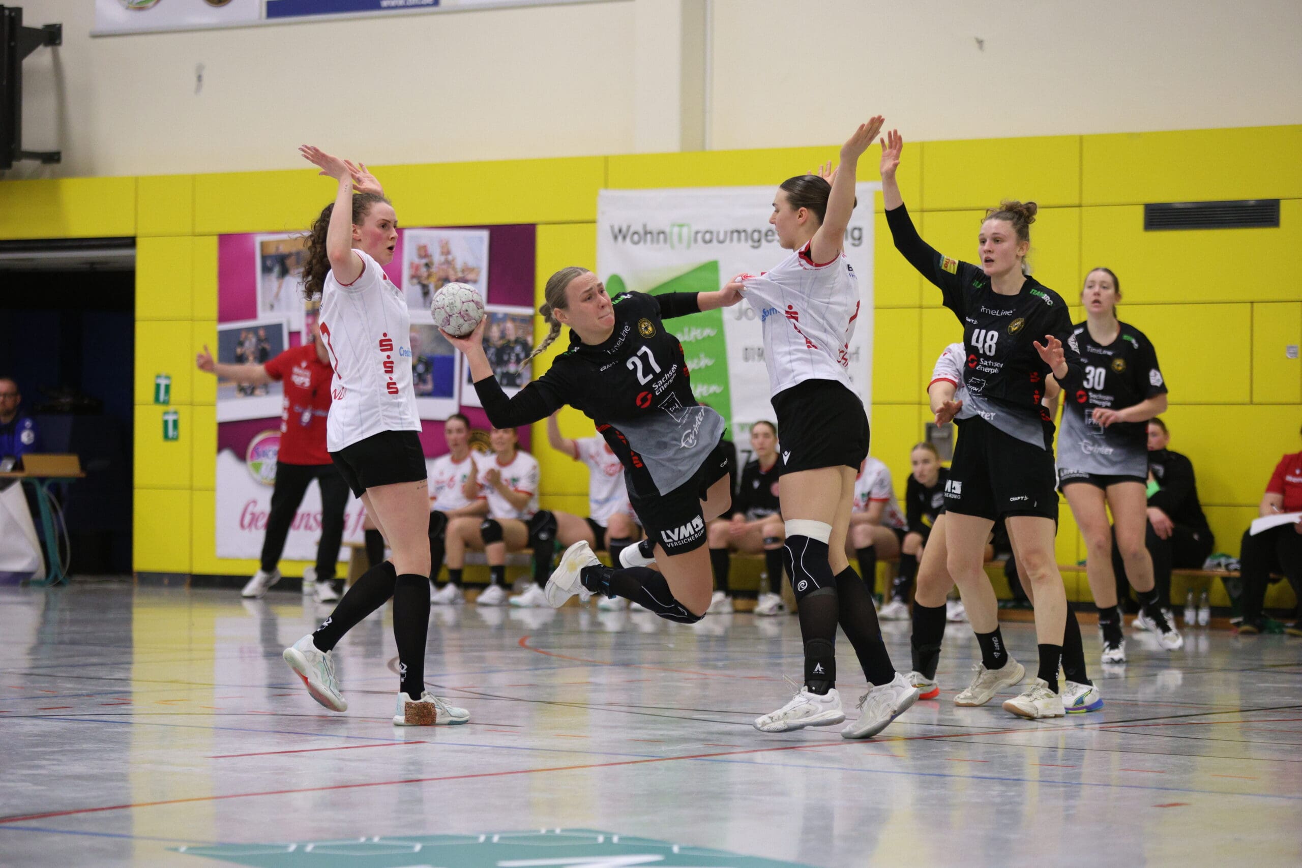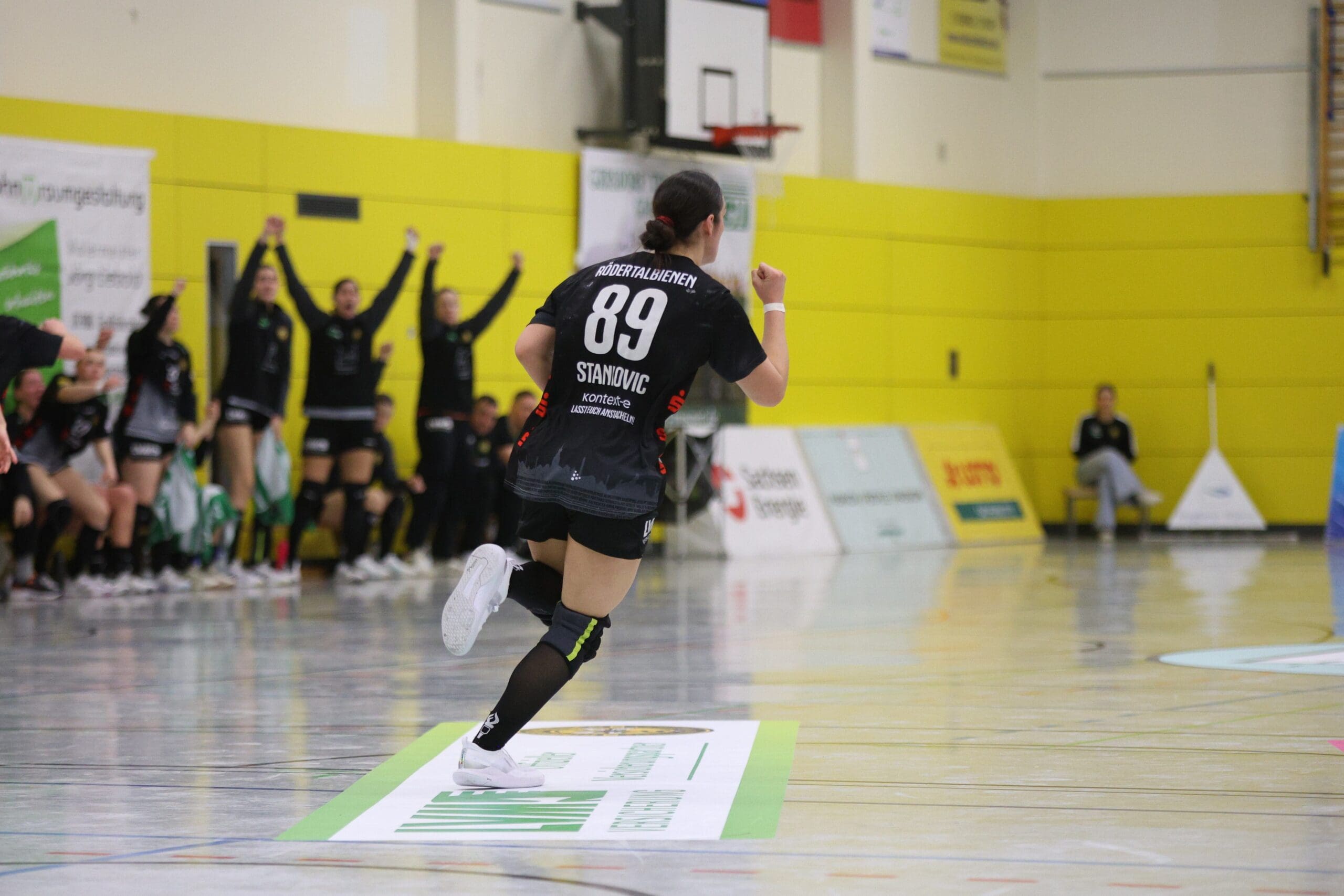 Cheftrainerin Maike Daniels hatte bereits im Vorfeld vor der Spielstärke der Solingerinnen gewarnt und ihre Vorahnung sollte sich auch bestätigen. Die Gäste begannen sehr selbstbewusst und übernahmen die Initiative. Die Rödertalbienen fanden schwer ins Spiel und machten zu Beginn des Spiels ungewohnt viele technische Fehler. Das nutzten die Gäste und gingen in der 13. Minute mit 7:4 in Führung. Daniels musste bereits früh ihre erste Auszeit nehmen und sie kam genau richtig. Sie forderte von ihrem Team eine wesentlich höhere Konzentration und konsequentere Abschlüsse. Nun kam mehr Ruhe in das Spiel und nach weiteren sechs Minuten konnte Rödertal zum 8:8 ausgleichen. Jetzt war es ein Spiel auf Augenhöhe, beide Teams schenkten sich nichts und so ging es beim 13:13 in die Halbzeitpause. Alles war noch offen und die zweite Hälfte musste die Entscheidung bringen.