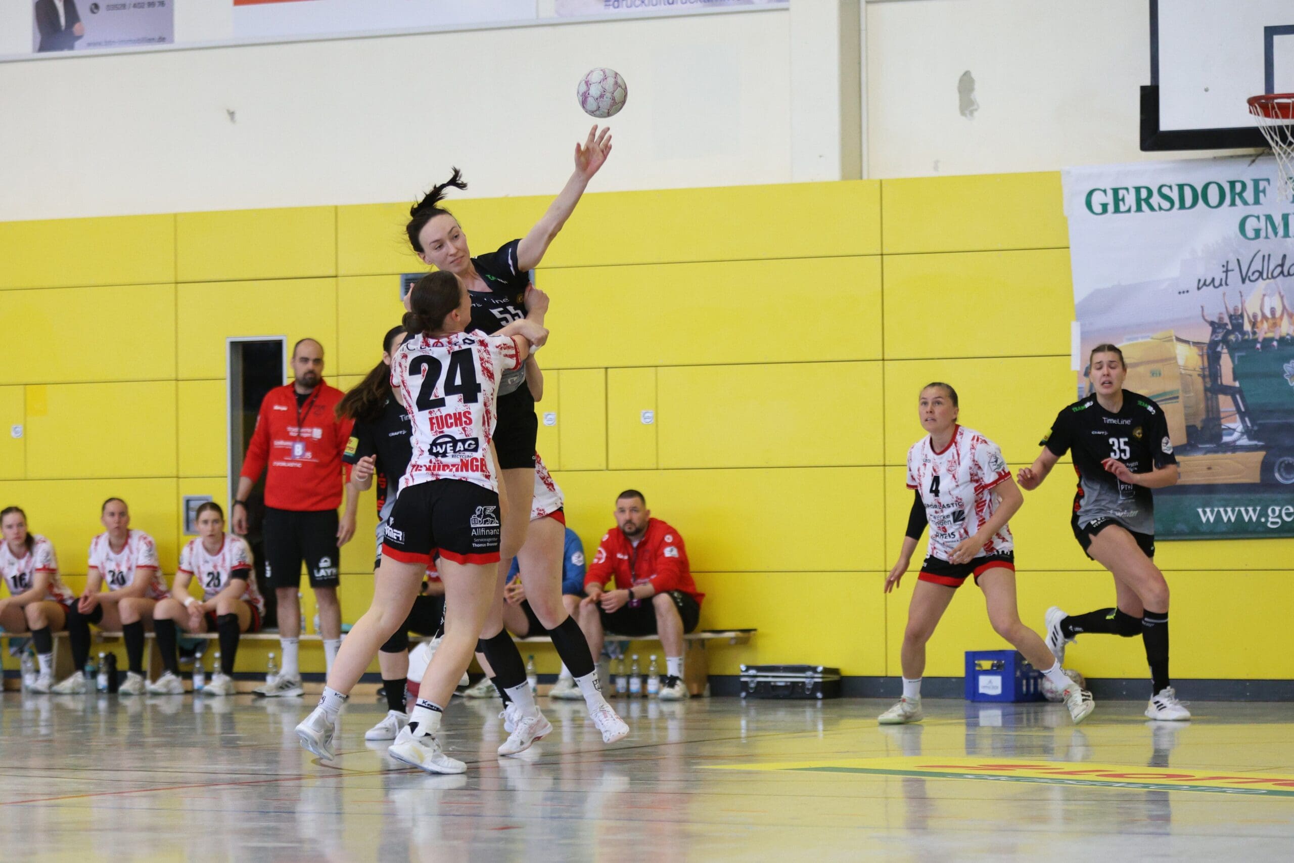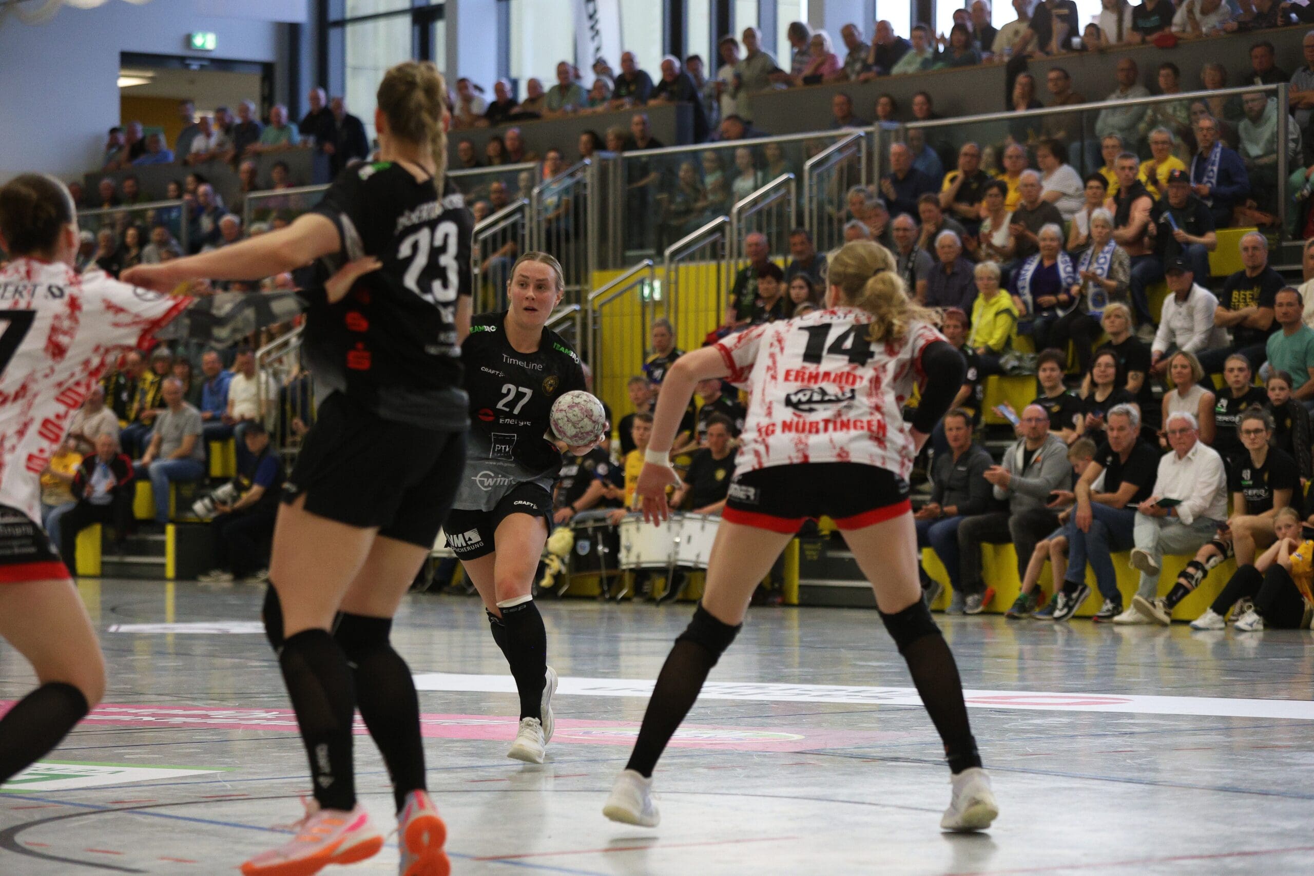 Anders als zuletzt im Spitzenspiel in Leipzig mit einer 6:0-Deckung starteten die Bienen wieder mit einer 5:1 Abwehr vor Torhüterin Ann Rammer. Nach der Führung von Alicja Pekala war die Nervosität auf beiden Seiten anfangs sichtbar. Die erste Zwei-Tore-Führung schaffte die Turngemeinde mit dem 5:3, wo sie einmal mehr ihr Tempospiel andeuteten. Auch wenn sich Bo Dekker vom Siebenmeterpunkt sicher zeigte, im Spielaufbau war zu viel Hektik drin. Nürtingen nutzte das konsequent – auch mit schnell vorgetragenen Kontern – zur 7:4-Führung nach 13 Minuten. So war die erste Auszeit von Maike Daniels nach dem 5:9-Rückstand folgerichtig.