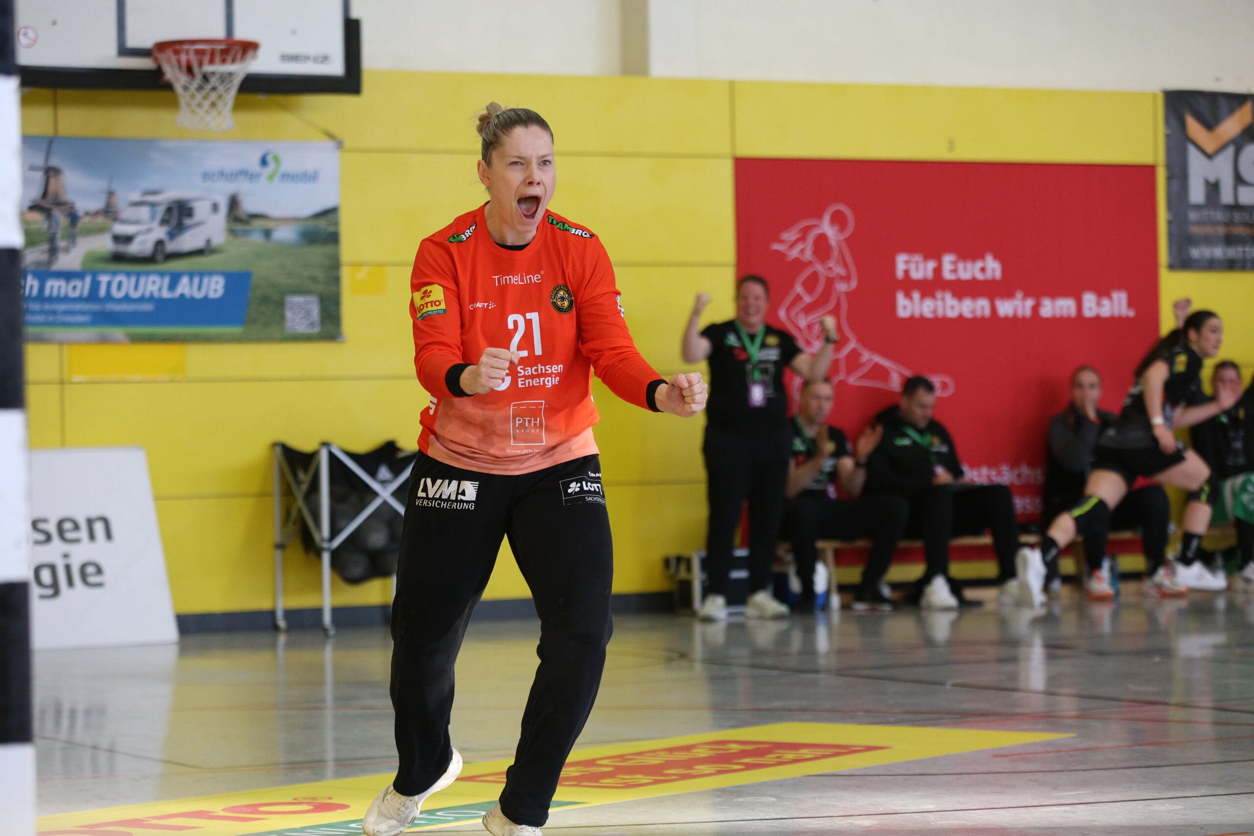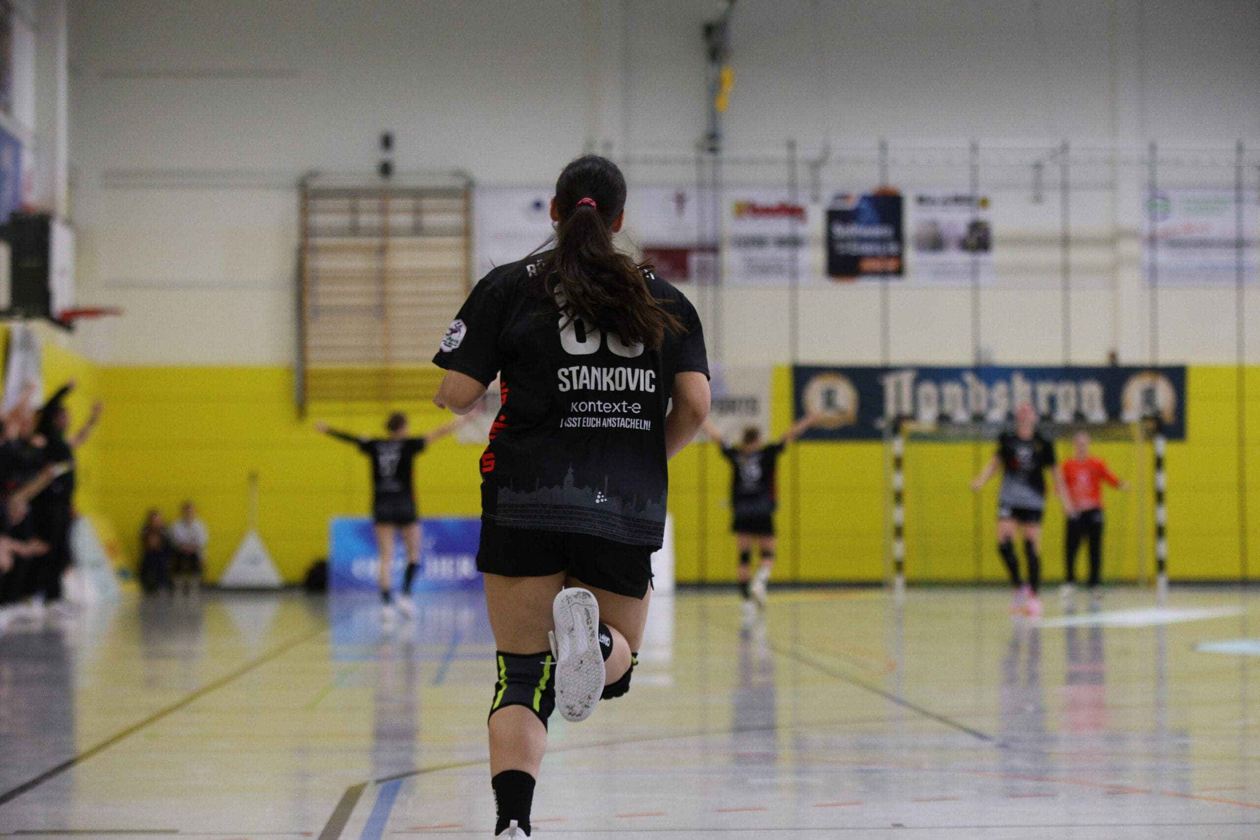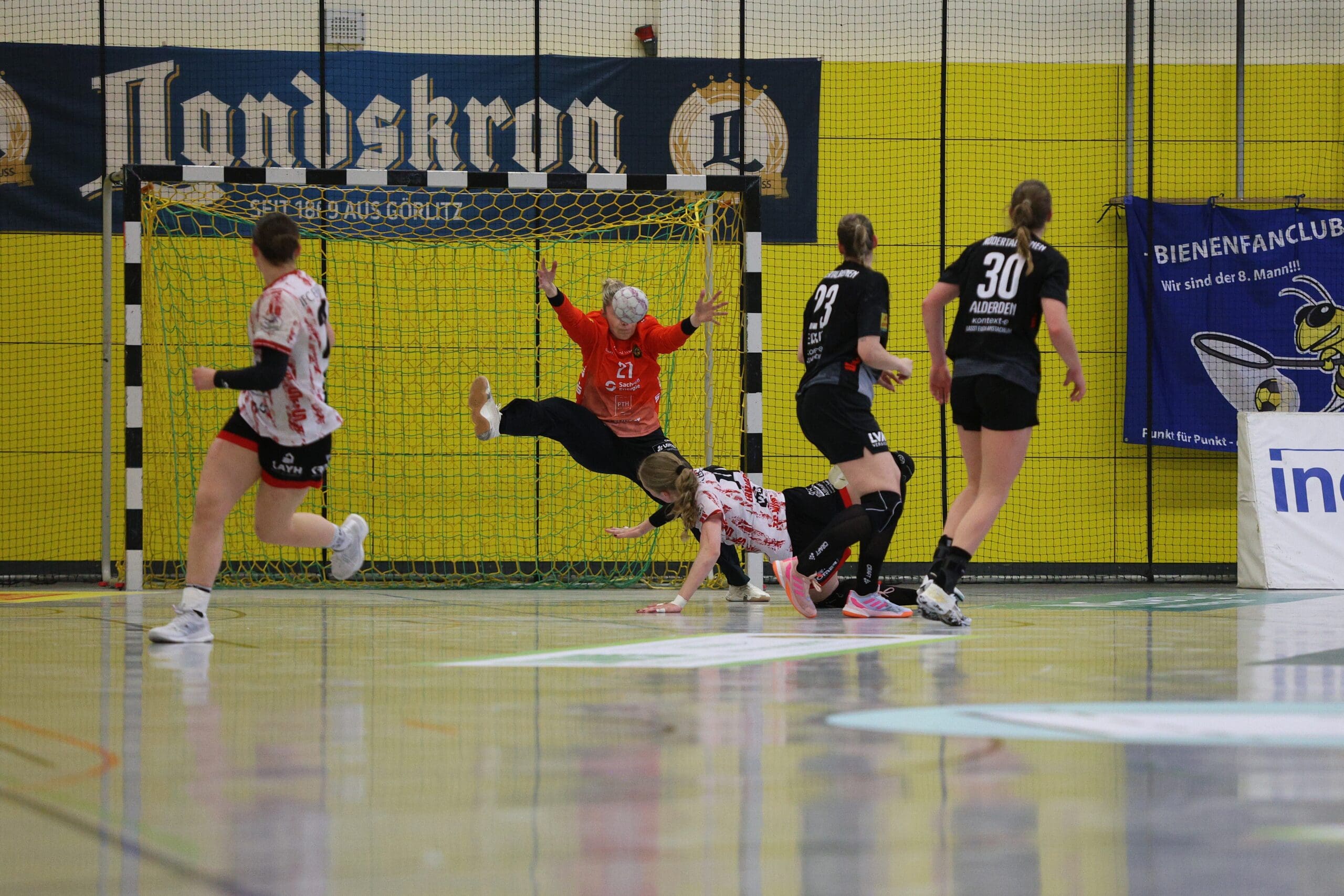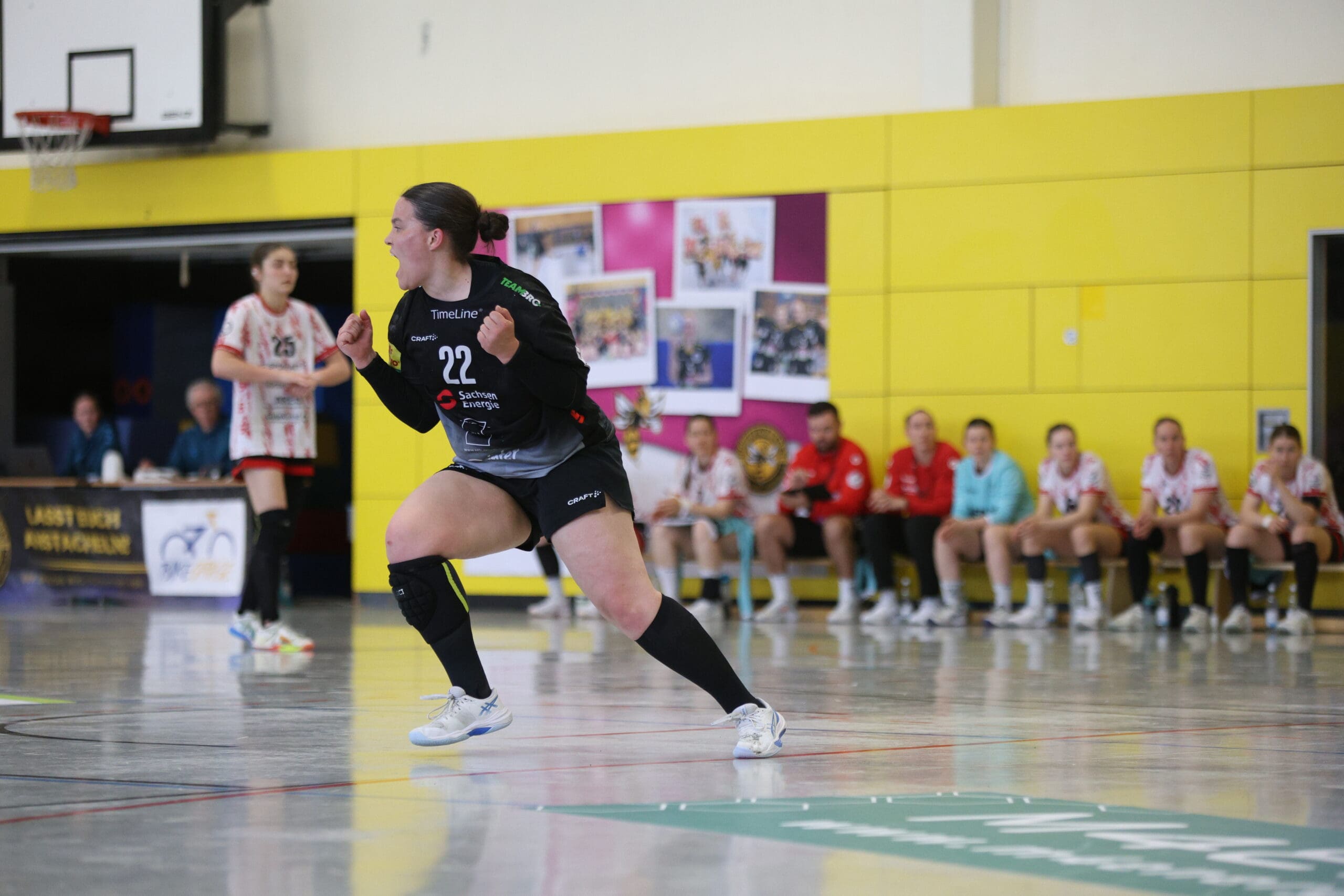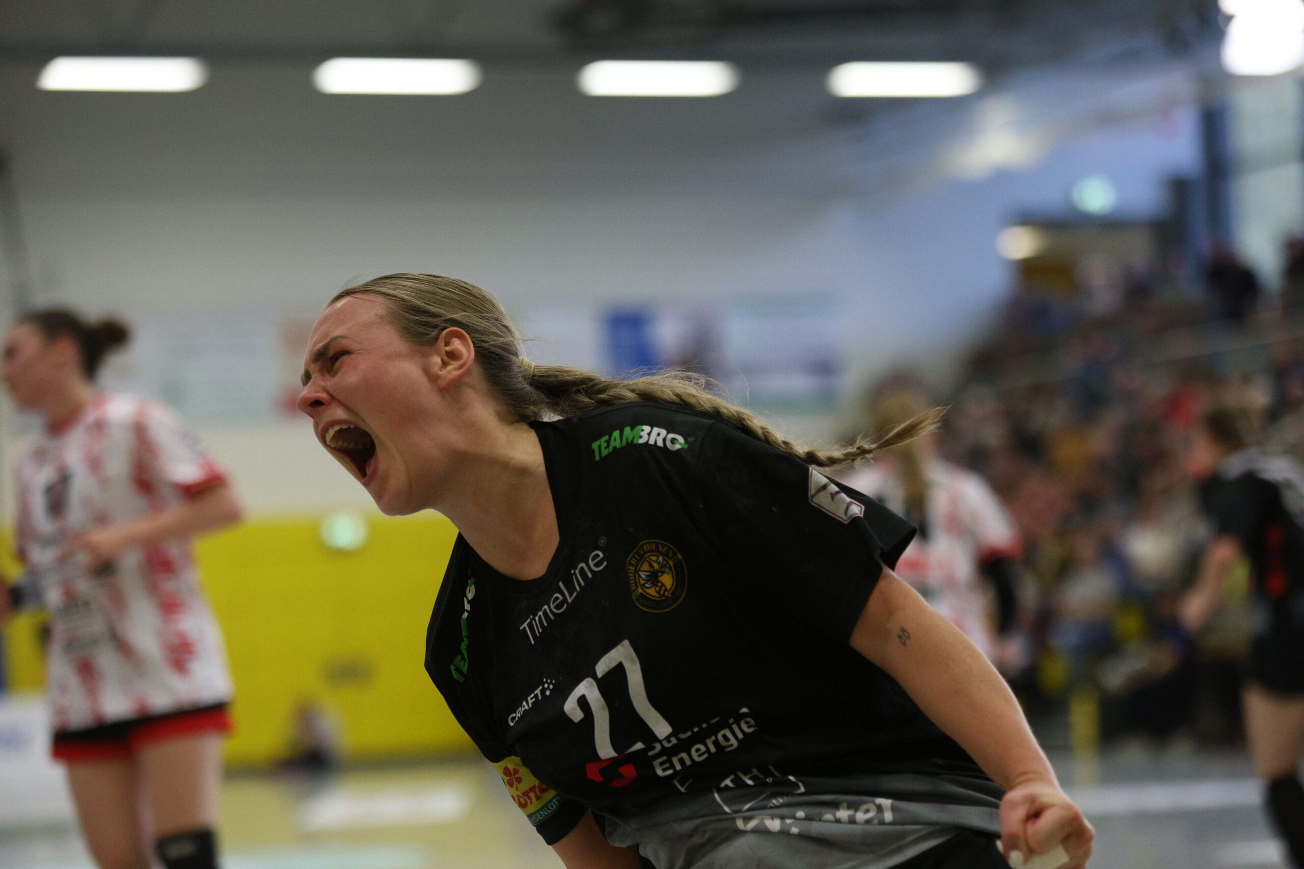 Bienen-Torhüterin Ann Rammer war dann zum richtigen Moment auf Betriebstemperatur. Im Angriff wurde das Tempo leicht verschärft, sichere Abschlüsse gelangen vor allem von den Außenpositionen. Nach 20 Minuten konnte der HCR auf 10:11 verkürzen, Natascha Foley erzielte dann über halbrechts den 11:11-Ausgleich und Eleonora Stankovic krönte die gute Phase mit dem Führungstreffer. Ann Rammer heizte dann mit einem gehaltenen Siebenmeter die Stimmung im Bienenstock an. Arwen Gorb setzte mit ihrem Treffer den 5:1-Lauf fort zum 13:11. Dann zeigte sie aus dem Rückraum mit dem 14:12 und mit einem Schlagwurf-Hammer zum 16:13, wer hier die ambitionierte Gastgeberin ist. So ging es mit einer Führung in die Kabine.