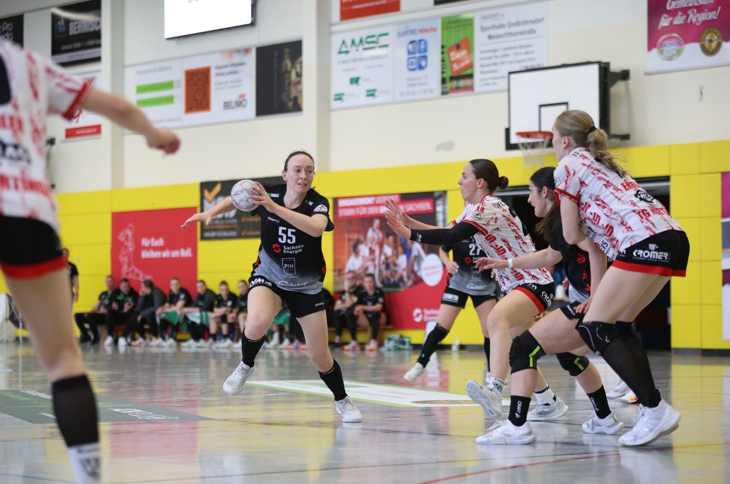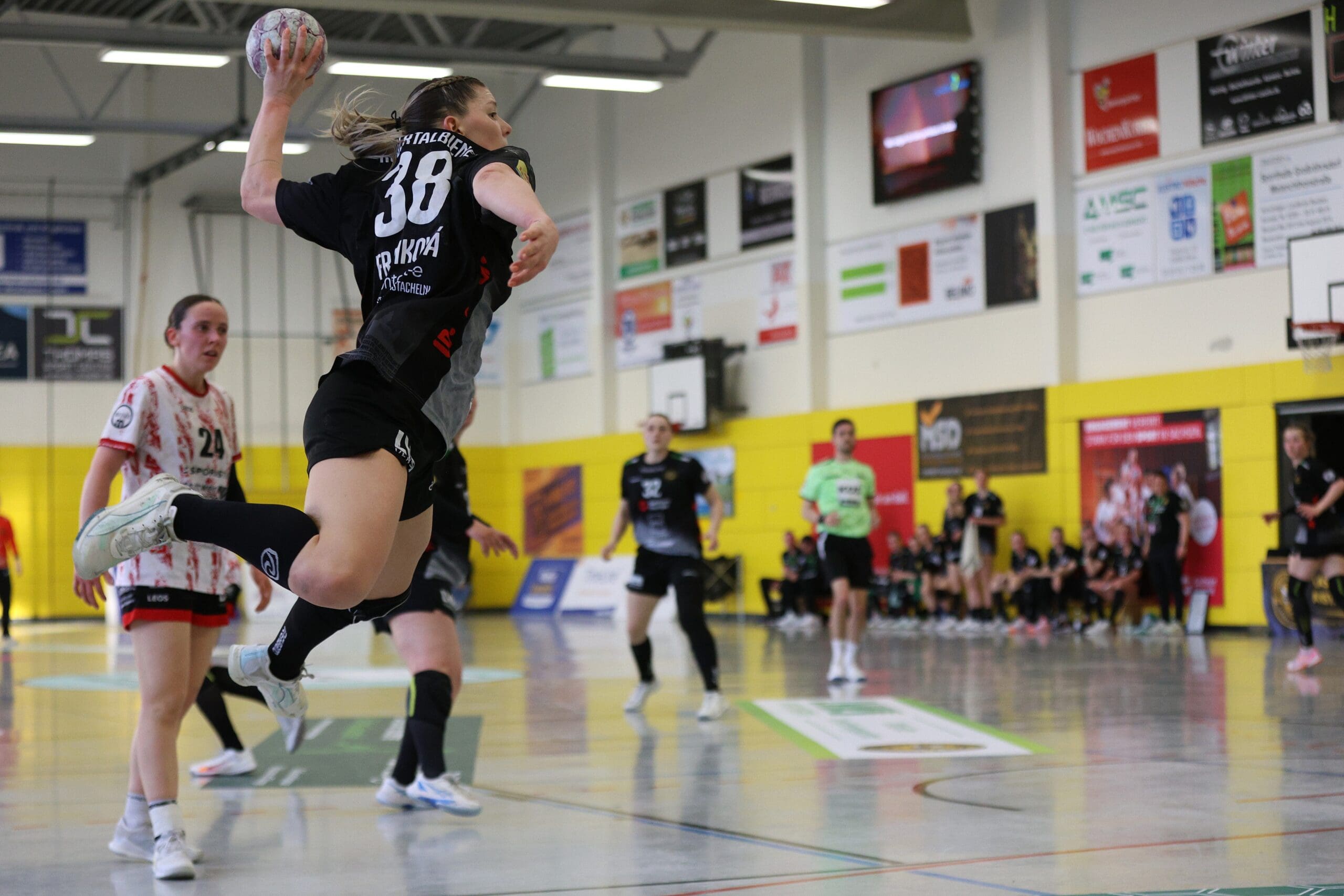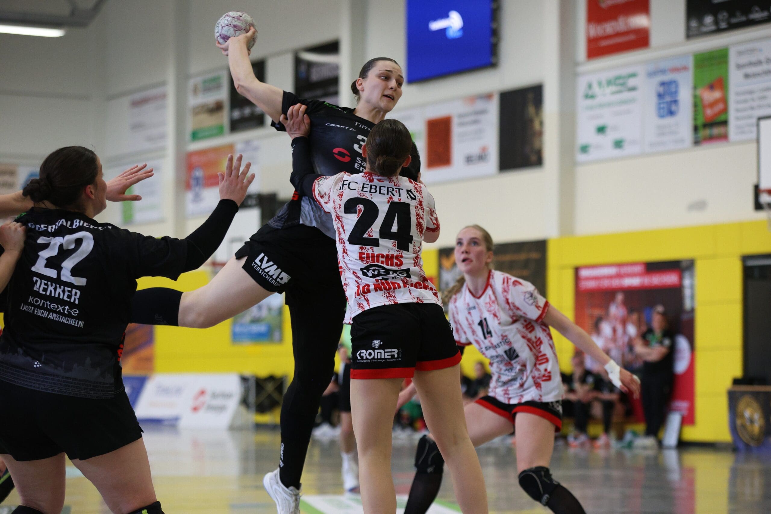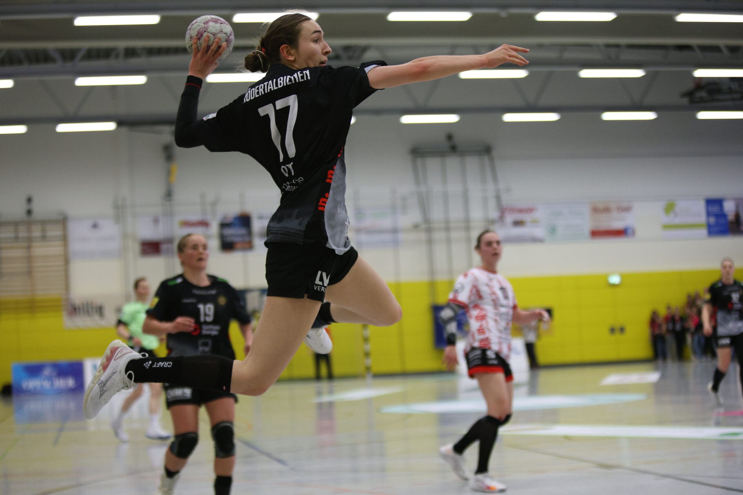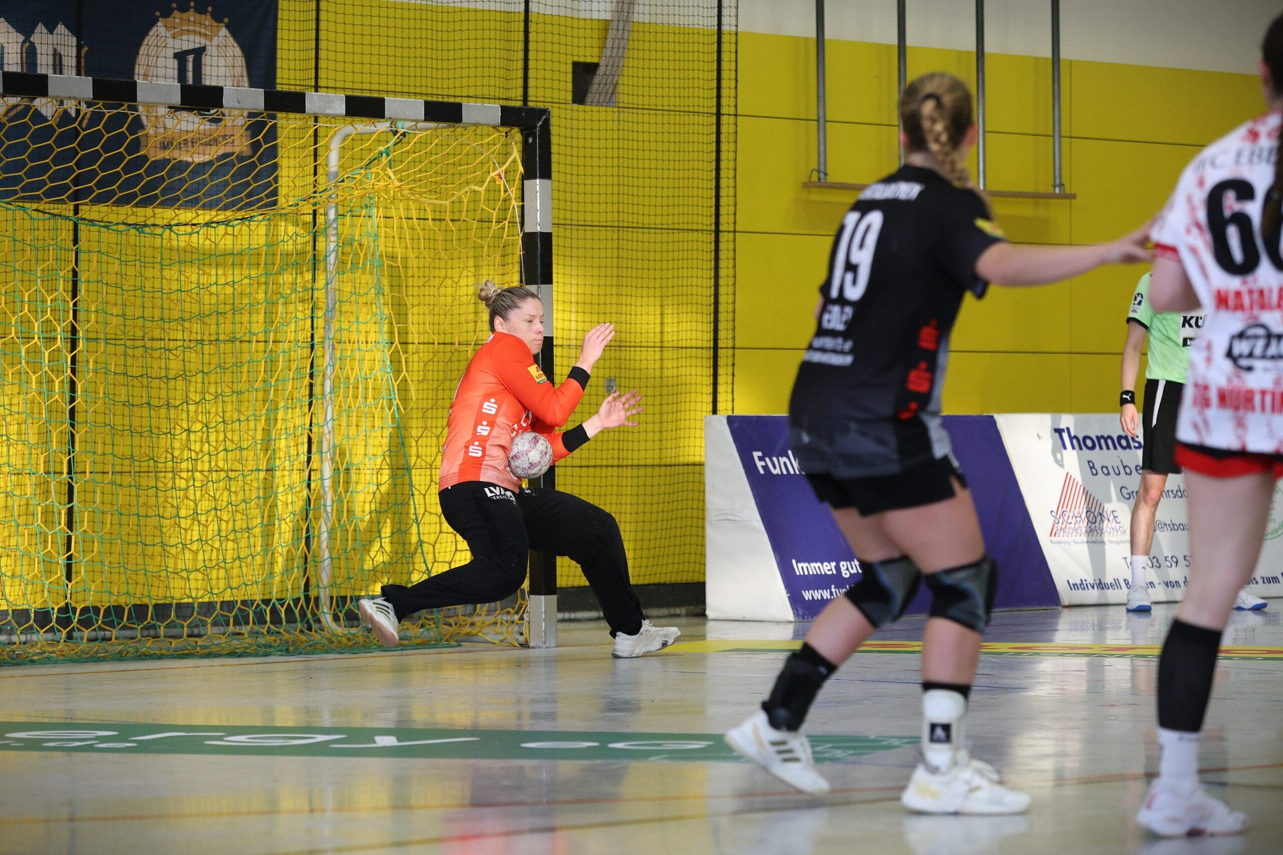 Bienen-Torhüterin Ann Rammer war dann zum richtigen Moment auf Betriebstemperatur. Im Angriff wurde das Tempo leicht verschärft, sichere Abschlüsse gelangen vor allem von den Außenpositionen. Nach 20 Minuten konnte der HCR auf 10:11 verkürzen, Natascha Foley erzielte dann über halbrechts den 11:11-Ausgleich und Eleonora Stankovic krönte die gute Phase mit dem Führungstreffer. Ann Rammer heizte dann mit einem gehaltenen Siebenmeter die Stimmung im Bienenstock an. Arwen Gorb setzte mit ihrem Treffer den 5:1-Lauf fort zum 13:11. Dann zeigte sie aus dem Rückraum mit dem 14:12 und mit einem Schlagwurf-Hammer zum 16:13, wer hier die ambitionierte Gastgeberin ist. So ging es mit einer Führung in die Kabine.