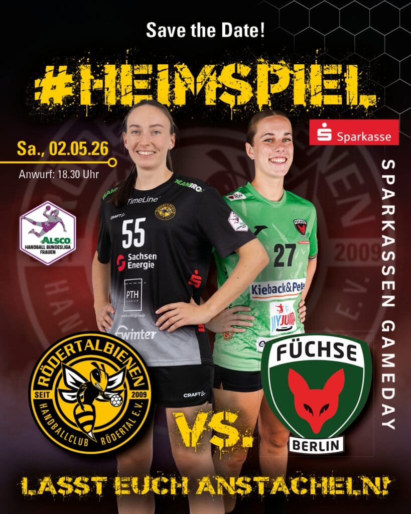 Die Rödertalbienen müssen am kommenden Samstag, 02.05.2026 gegen die Füchse Berlin ihr drittes Spitzenspiel in vier Wochen bestreiten. Und mit dem Hauptstadtclub kommt quasi das Team der Stunde zum HC Rödertal in den Bienenstock. Anwurf der Partie ist um 18:30 Uhr.